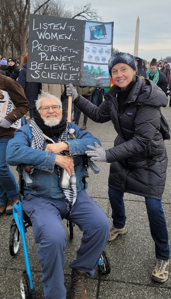 Six of us from North Baltimore Mennonite Church plus David marched. Some of us arrived by train. Erin and Chris and David and I sat in facing seats. Others arrived on the Quaker Bus. We joined 49,994 to make 50,000 strong. Singing, dancing, yelling, beautiful and outrages placards. As usual Amy Goodman of Democracy Now was there. As an aside, let me urge you to get your news from Democracy Now. No sponsors. Amy is an activist and no stranger to jail. Two other hosts: Juan Gonzalez who came up through the Young Turks in NYC and then became an investigative reporter. Also, Nermeen Shaikh, a writer with a degree in philosophy from Cambridge.